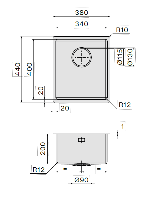 Chiuveta FALMEC COMO 34, 1 Cuva, Dimensiune exterioara 370 x 430 mm, AISI 304 otel inoxidabil, Radius 12mm, Preaplin Perimetral, Fibra anti-zgomot, Sistem drenaj FALMEC, Instalare flush sau pe blat