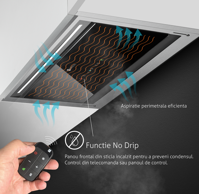 Gatitul pe plitele cu inductie genereaza frecvent aburi care se transforma in picaturi de condens pe suprafata hotei, riscand sa cada pe spatiul de gatit de dedesubt.