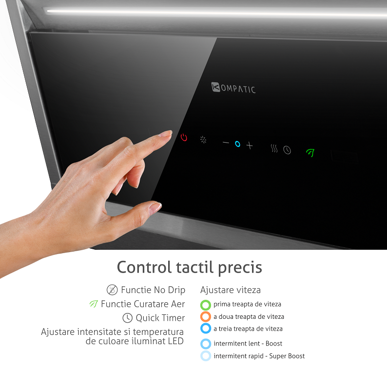 Hota incorporabila Kompatic by Turbionaire, Yara 60 KPYR60BIS, Motor 800mc/h, Clasa A+, Control prin Gesturi si Touch, Sistem anti-condens No Drip, Telecomanda, Functie curatare aer, Iluminare LED ajustabila, 60 cm, Inox