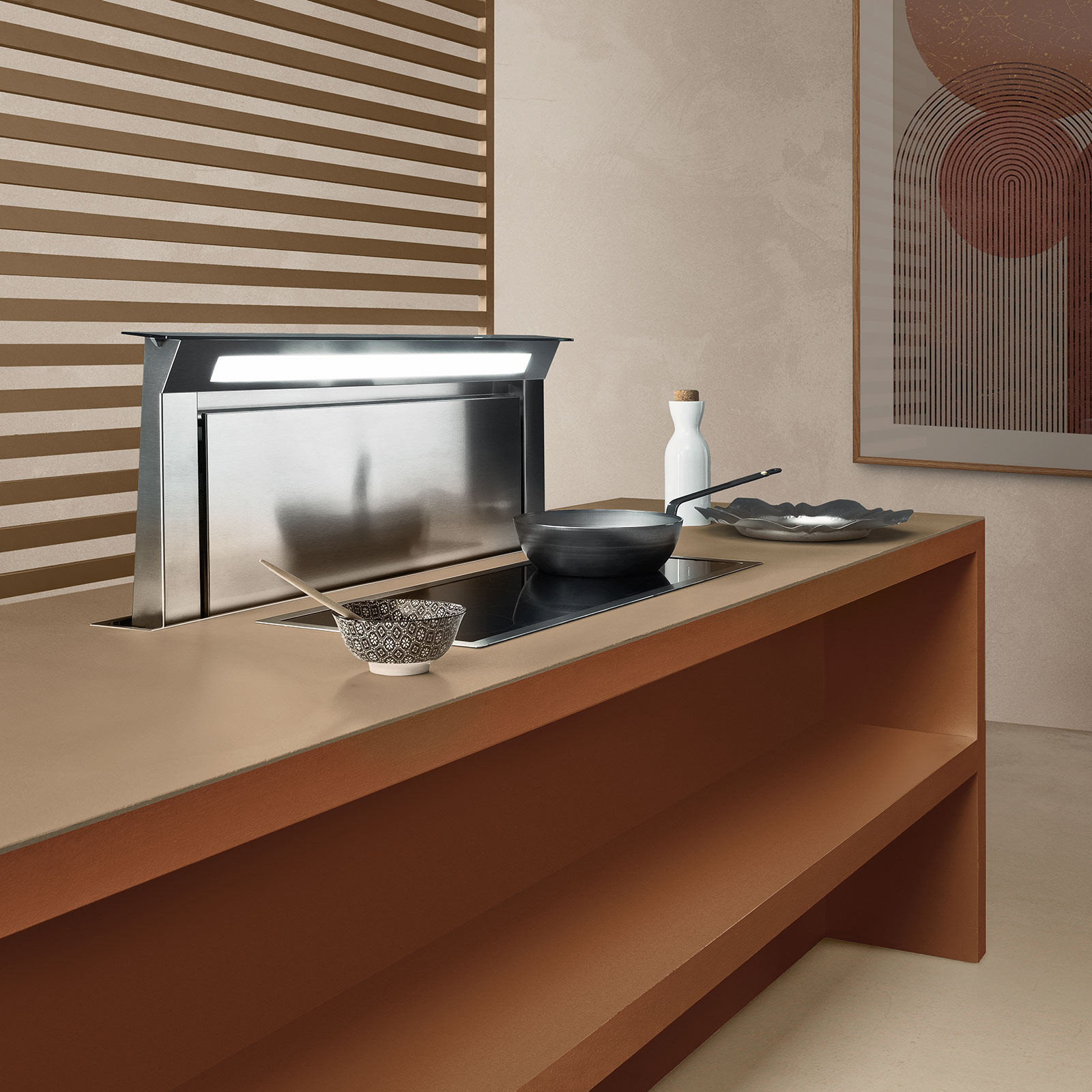 Falmec Down Draft este o hotă cu aspirație din blat, concepută pentru integrare discretă și eficiență ridicată în bucătăriile moderne. Sistemul de aspirație perimetrală optimizează captarea aburilor și mirosurilor, iar panoul cu control tactil oferă utilizare intuitivă. Construcția cu cadru din oțel inoxidabil AISI 304 asigură durabilitate și un aspect elegant, completat de iluminarea cu bandă LED.