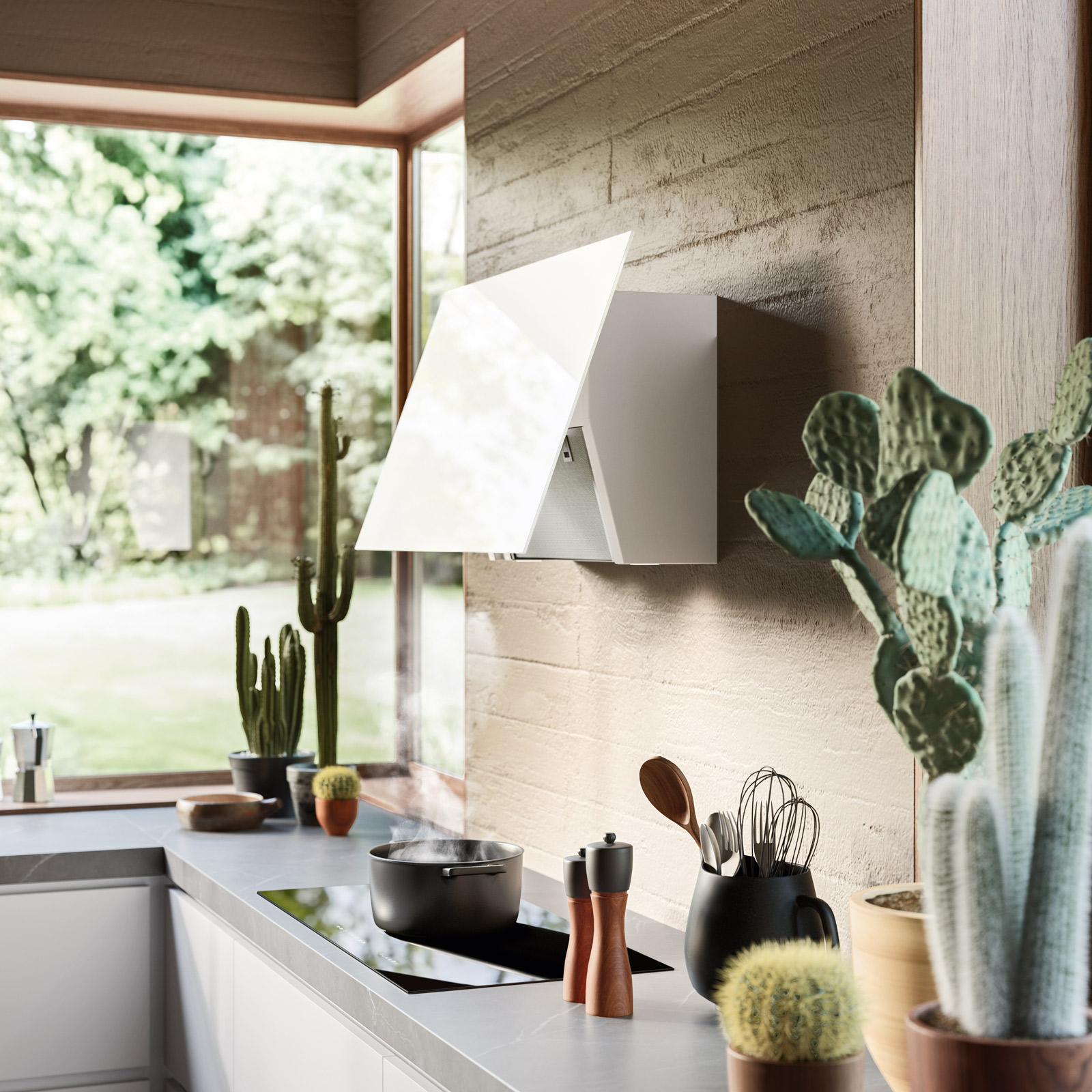 Falmec Cover 85 Alb este o hotă de perete cu design minimalist, creată pentru a se integra armonios în bucătăriile moderne. Panoul frontal din sticlă securizată albă oferă un aspect elegant și uniform, ascunzând filtrele și elementele tehnice pentru un aspect curat și contemporan. Designul subțire și liniile simple transformă hota într-un element discret, dar rafinat al spațiului de gătit. Modelul este echipat cu un motor de 600 m³/h, capabil să elimine eficient aburul și mirosurile generate în timpul gătitului. Iluminarea Dynamic LED permite reglarea temperaturii culorii pentru o lumină adaptată atmosferei din bucătărie, iar comenzile electronice oferă control intuitiv al funcțiilor. Hota poate funcționa atât cu evacuare externă, cât și în mod recirculare, utilizând filtre de carbon pentru menținerea unui aer curat.