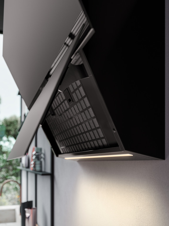 Aspirație frontală - Direcționează fluxul de aer prin zona frontală a hotei, asigurând o captare rapidă și eficientă a aburului și mirosurilor direct de la sursă.