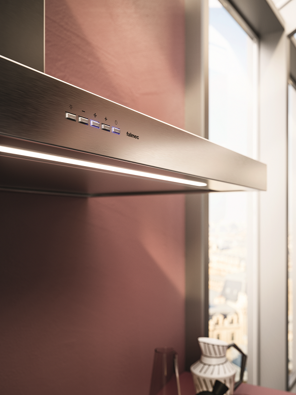 Hota de perete FALMEC PLANE PLUS L=120 cm, Culoare Inox, Motor 800 mc/h, Sistem de comunicare wireless intre plita si hota Falmec, Aspiratie perimetrala, Iluminare LED dimabila si Dynamic Control electronic, Fabricatie Italia, Garantie 5 ani