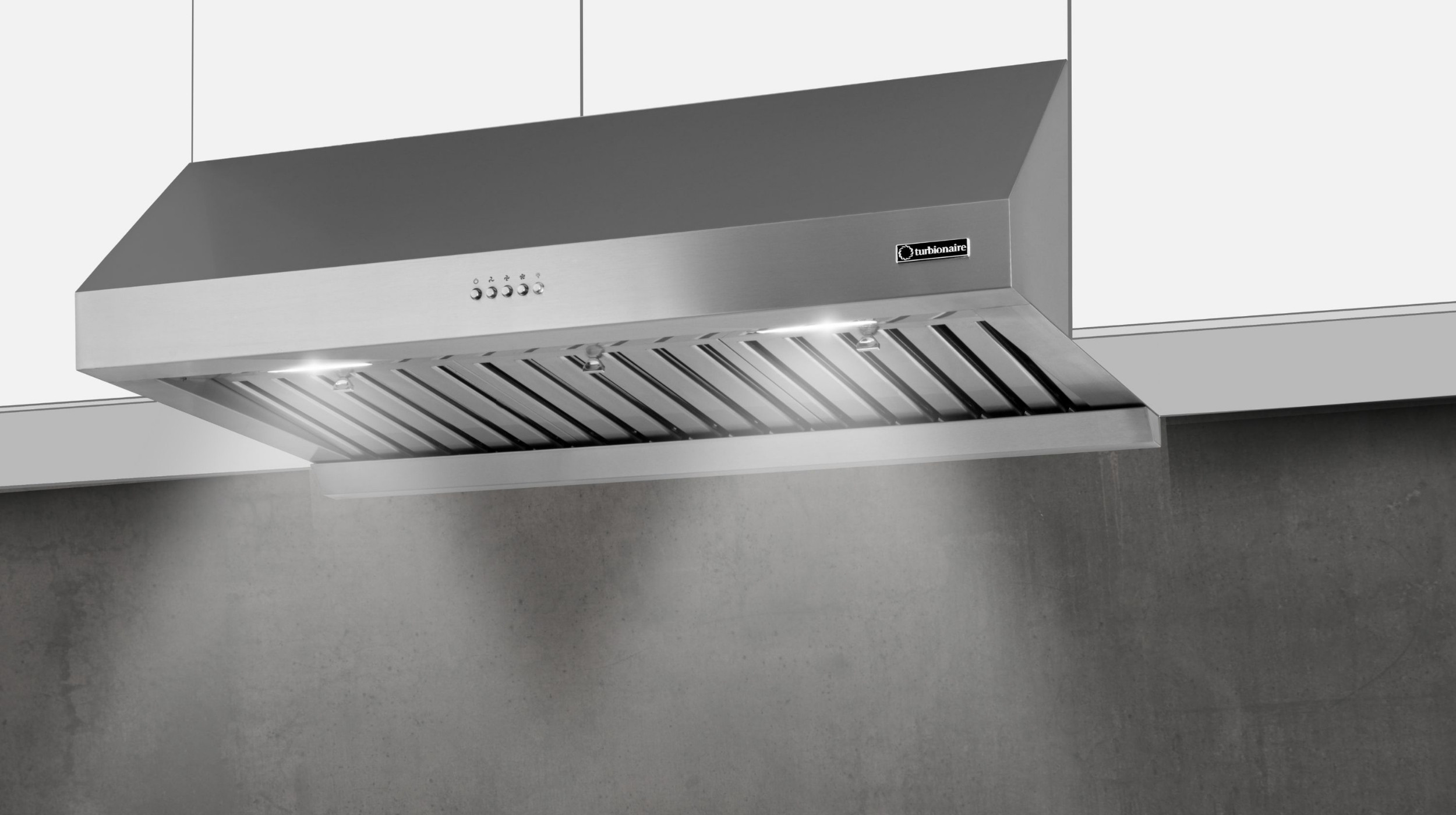 Hota semi-incorporabila Turbionaire Cook 90 Pro din otel inoxidabil este o prezenta spectaculoasa in zona spatiului de gatit.