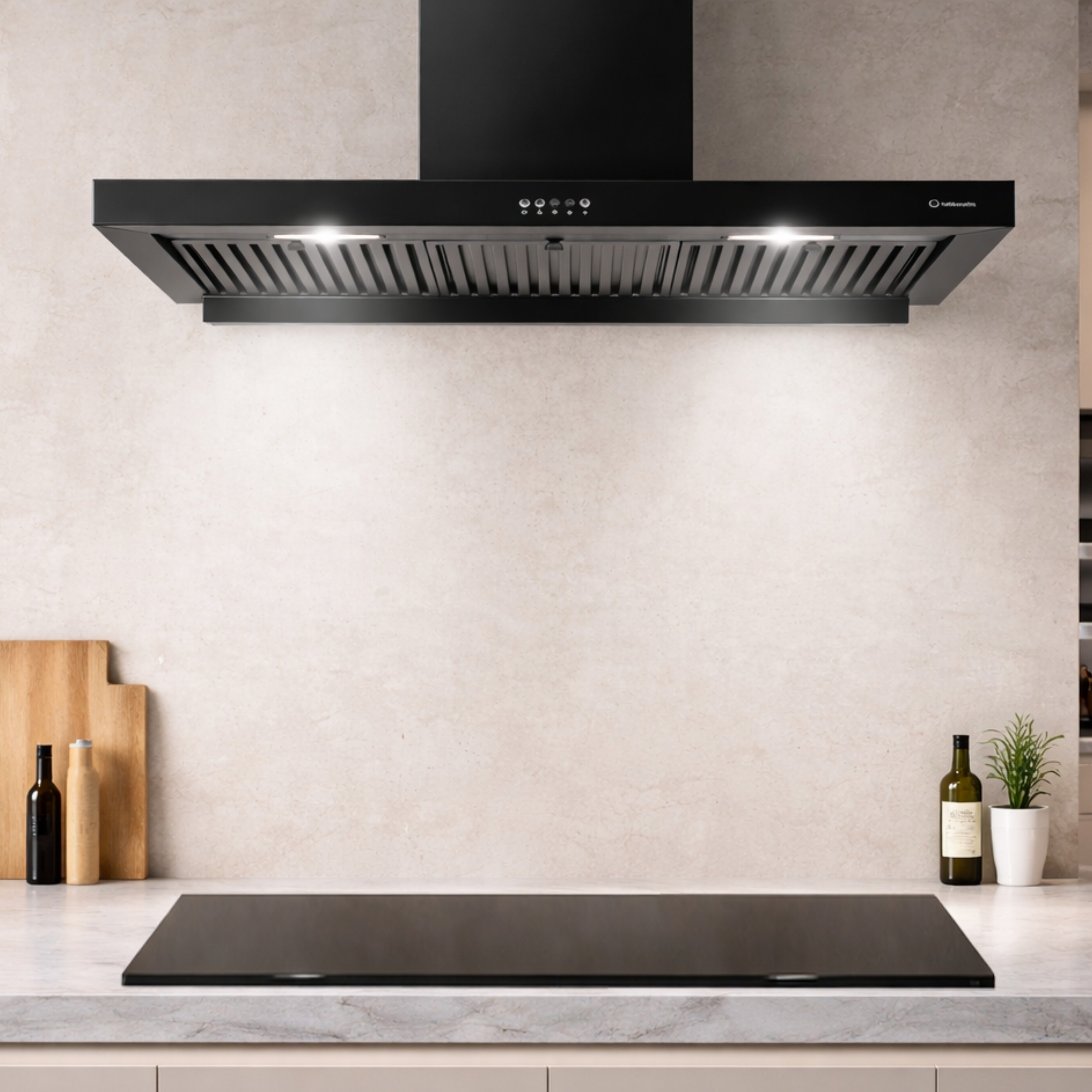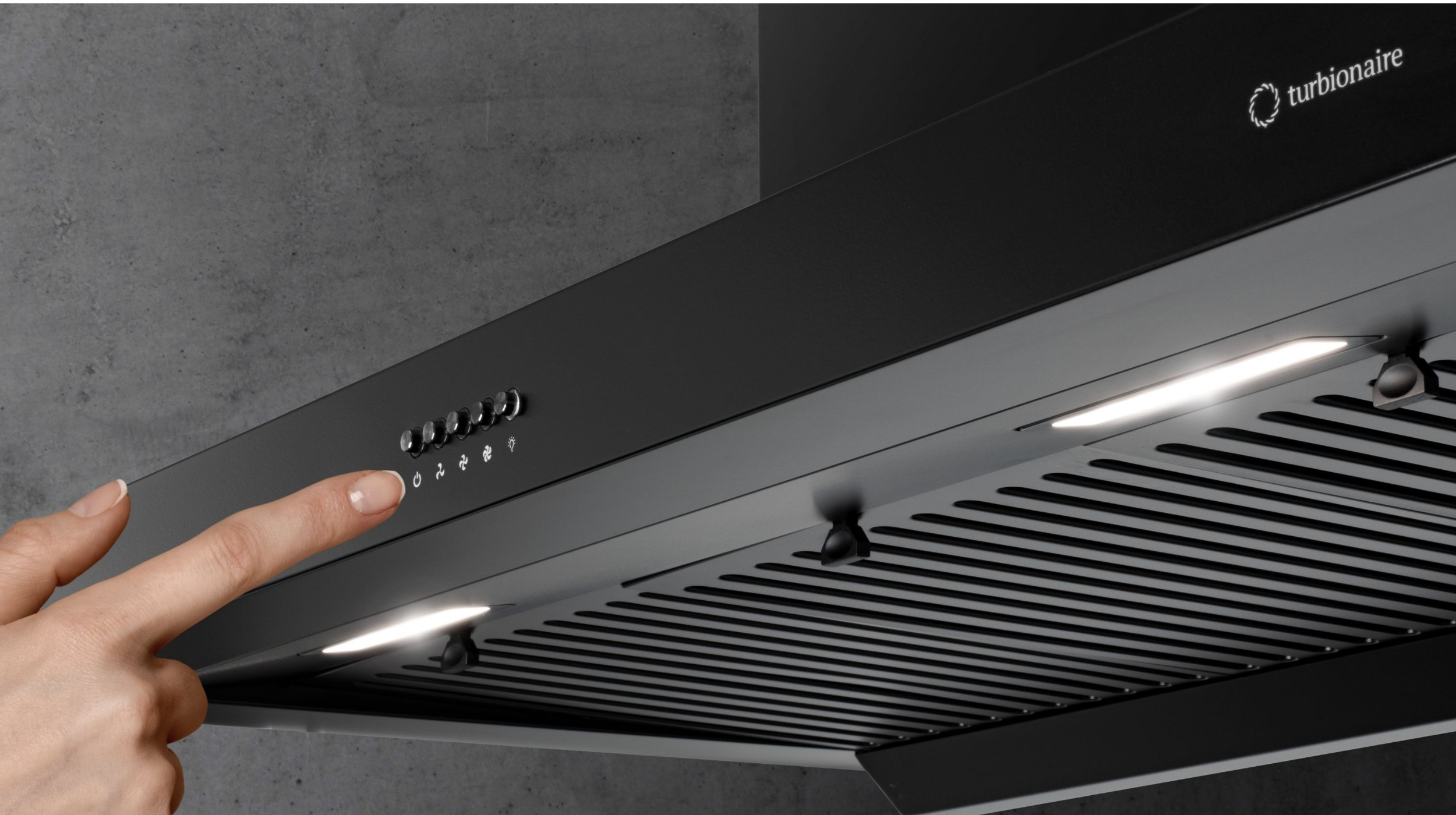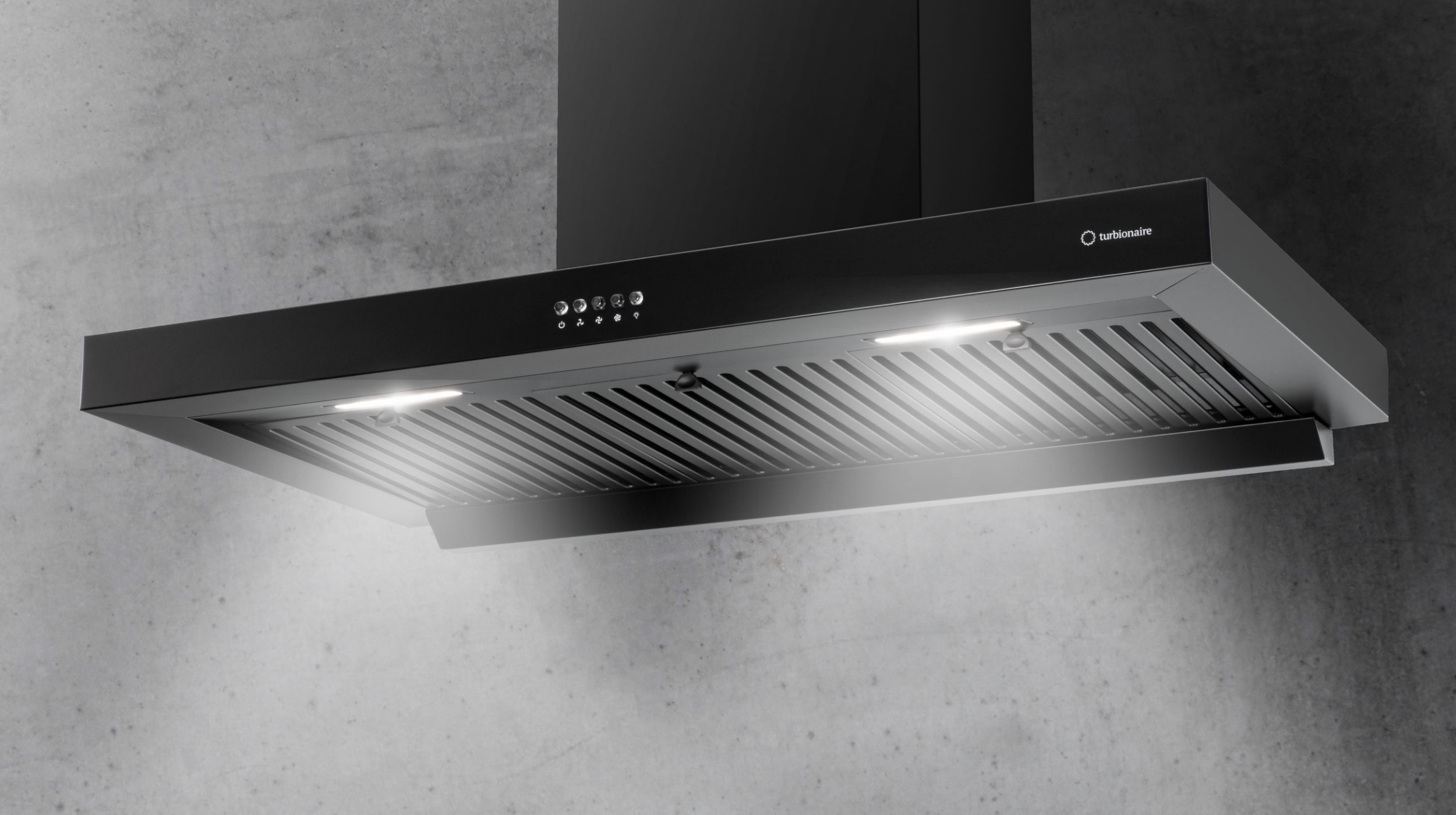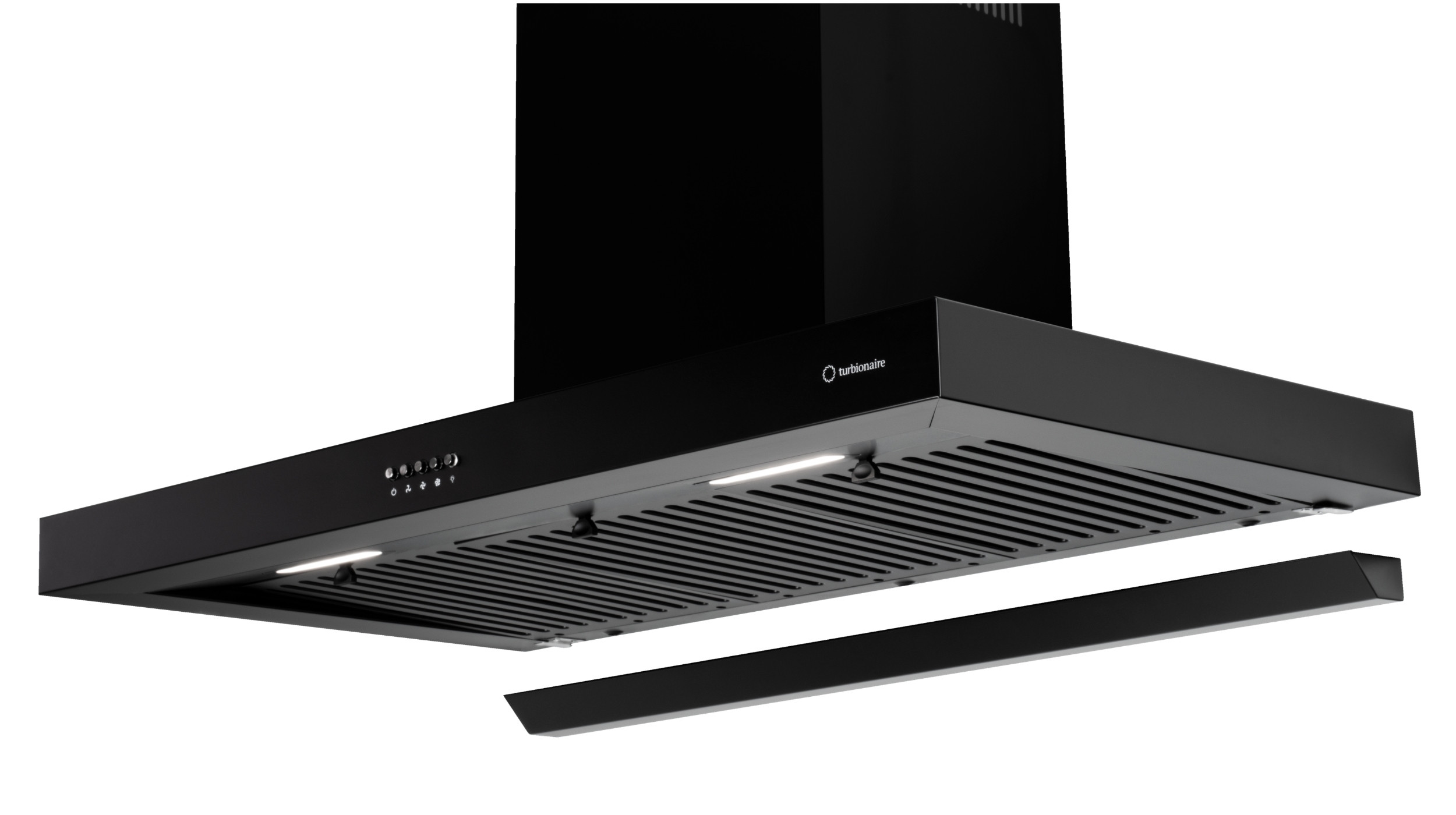 Hota de perete Turbionaire Chef 90 Wall Pro Black THC90WPB, Motor brushless 800 mc/h, Clasa A++, Colector de grasimi, Filtre Baffle Avansate, Control electronic, Iluminare LED 4000K, 3 viteze + Boost, Negru