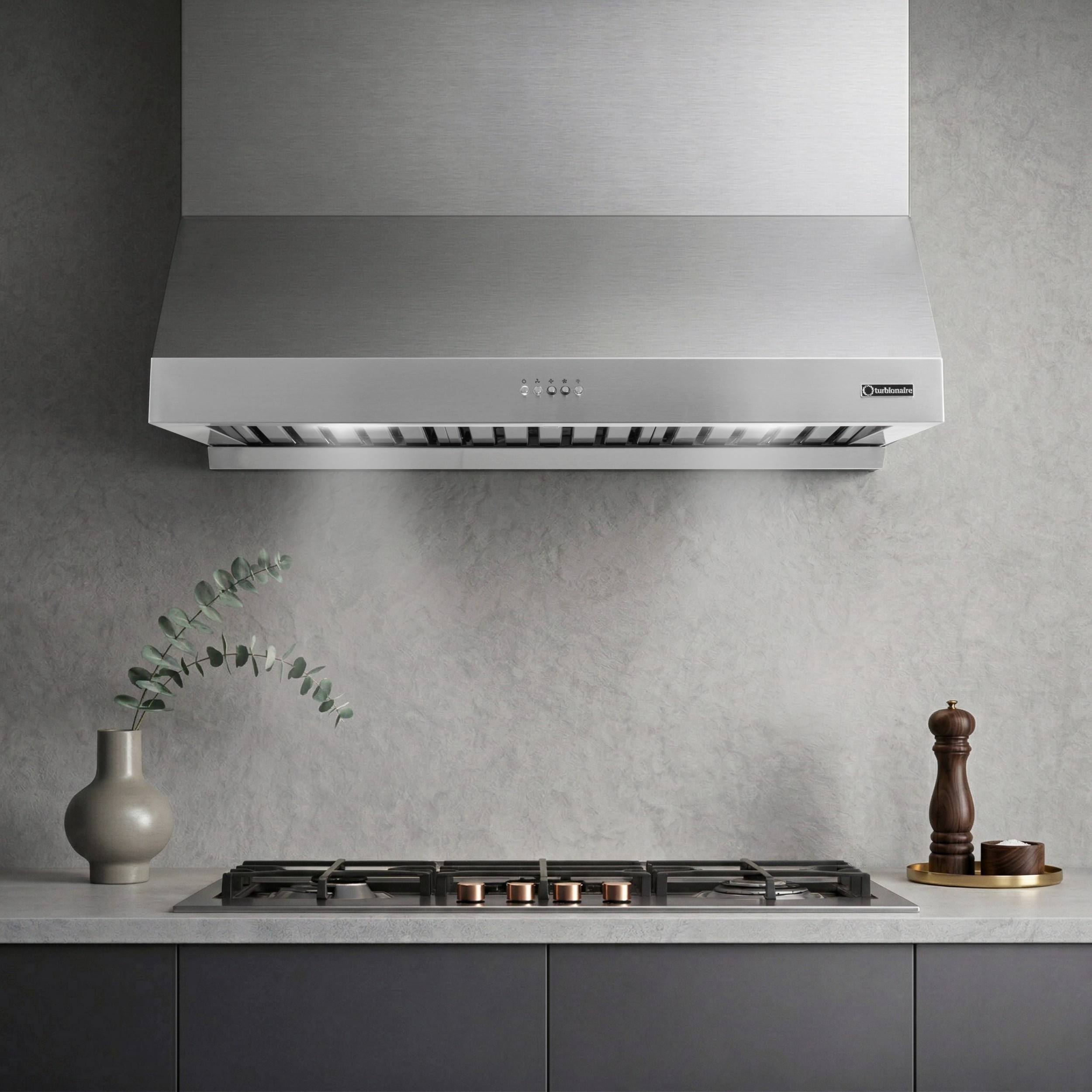 Hota de perete Turbionaire Cook 90 Pro din otel inoxidabil este o prezenta spectaculoasa in zona spatiului de gatit.