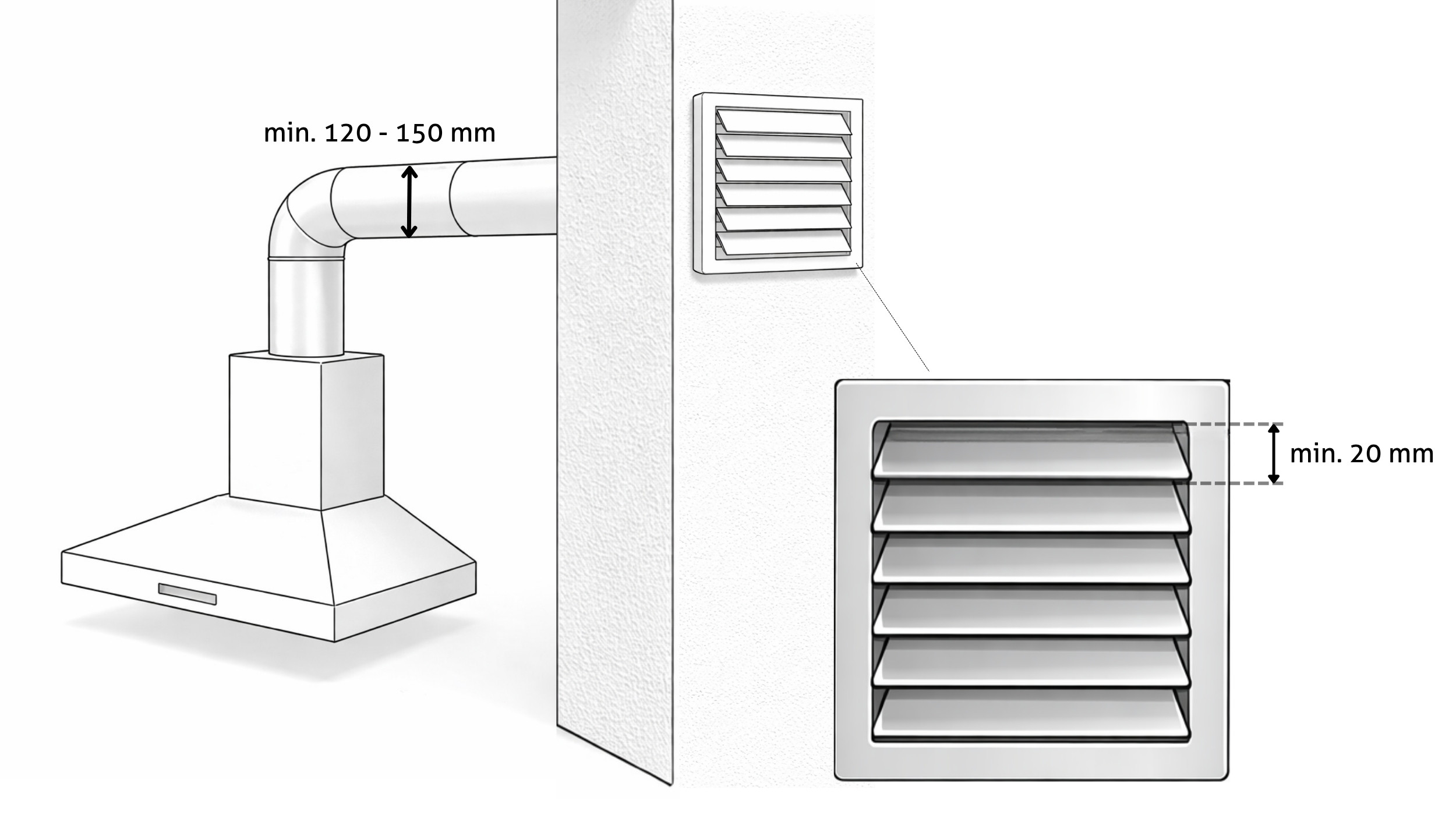 La exterior se va utiliza o grilă gravitațională sau o grilă de exterior cu lamele distanțate minimum 20 mm între ele, fără plasă anti-insecte.