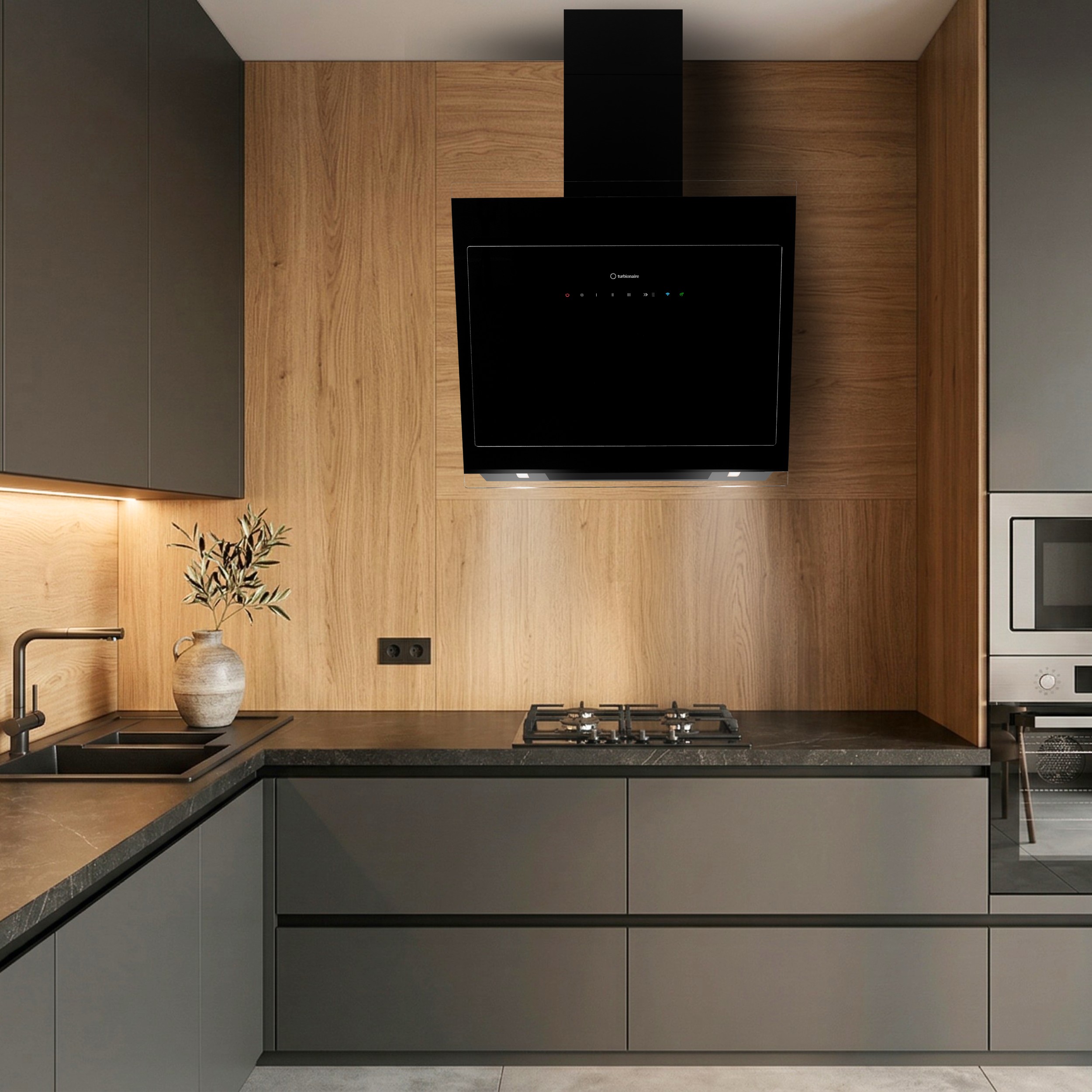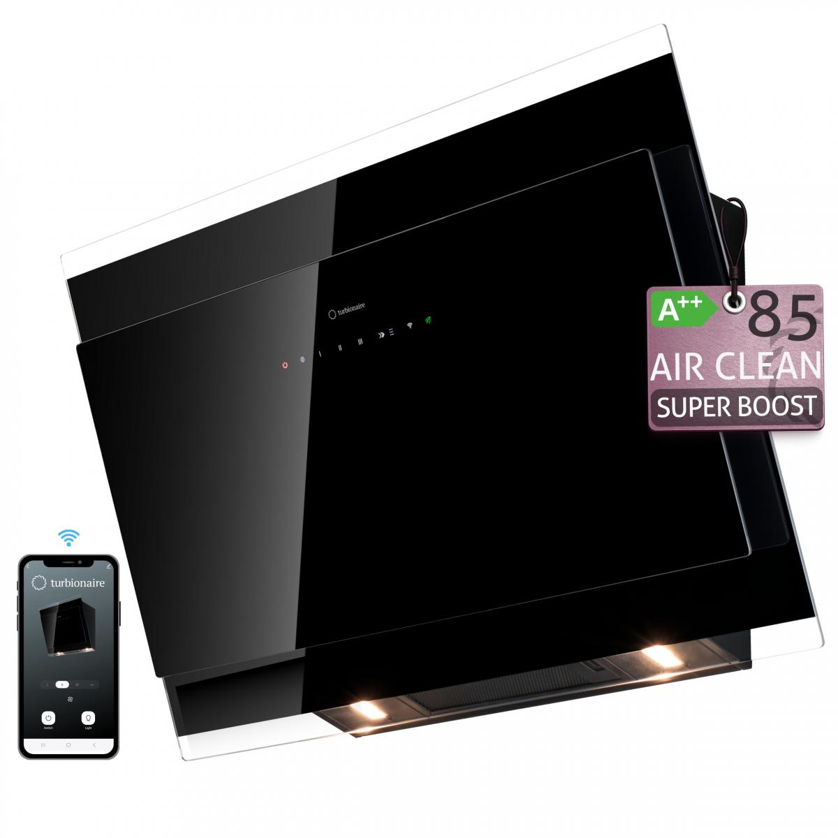 Hota de perete Turbionaire IVY 85 Wall Black TVY85WB, Motor 800 mc/h, Conexiune WIFI, Clasa A++, Functie curatare aer, Reminder curatare/schimbare filtru, Iluminare LED, 3 viteze, Boost si Super Boost, 85 cm, Negru