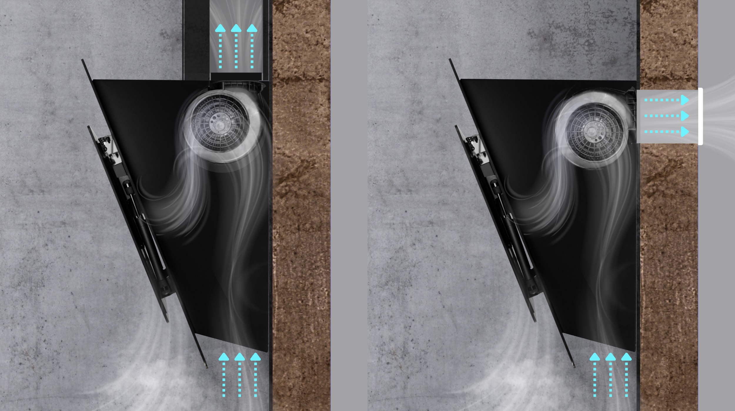 Dublă posibilitate de evacuare - Unitatea oferă opțiuni versatile de evacuare a aerului, permițând conectarea fie prin partea superioară (verticală), fie prin partea din spate (orizontală) pentru o flexibilitate maximă în instalare prin schimbarea poziției motorului în momentul instalării.