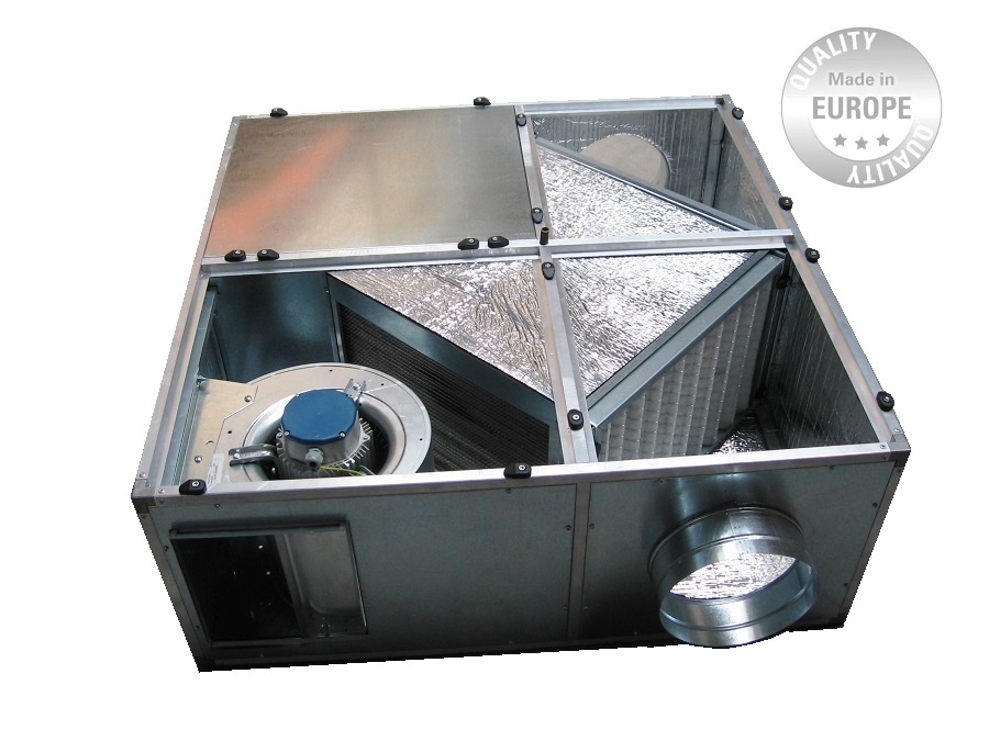 Ventilatorul este centrifugal dublu aspirant cu motor cuplat direct. Motorul are 3 trepte de viteza si este prevazut cu rulmenti cu bile pentru a minimiza vibratiile si nivelul de zgomot.
