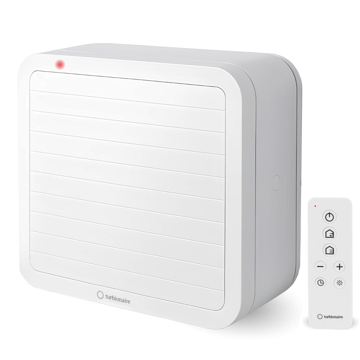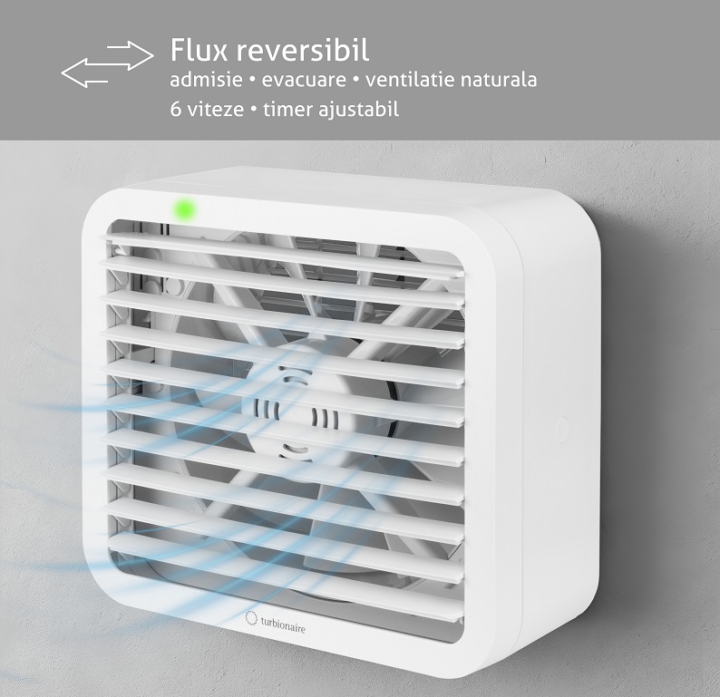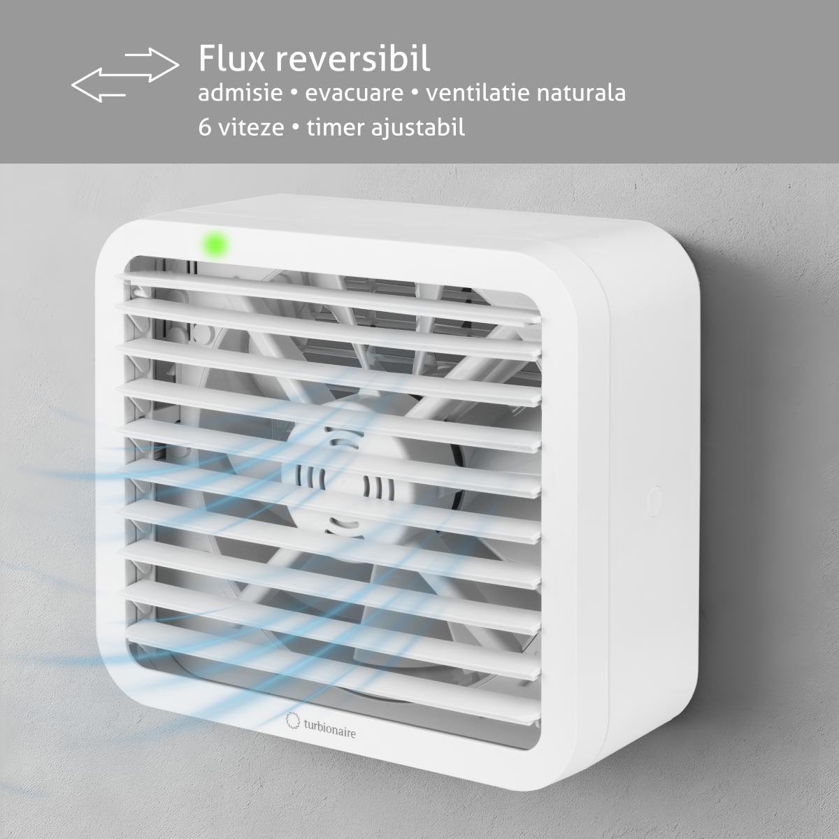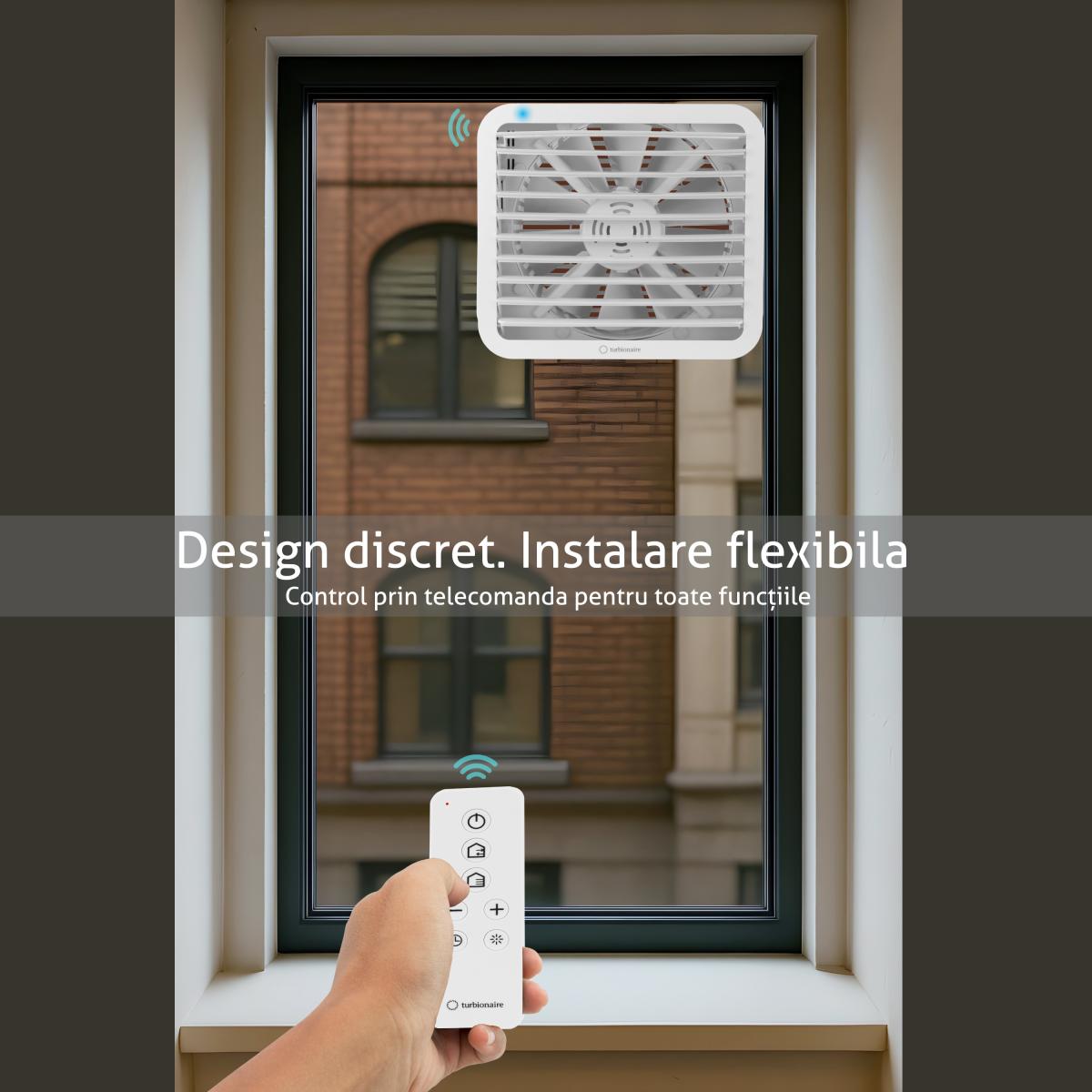 Ventilator reversibil Turbionaire FLEX 300 RVS TF300ARR, montaj fererestra/perete, Telecomanda, Timer ajustabil, Jaluzele automate, 6 viteze, Debit aer 800 mc/h - evacuare si 632 mc/h - aspiratie, Functie Ventilatie Naturala, indicator LED, alb mat