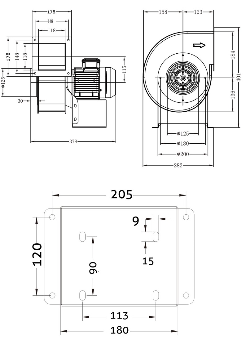 Ventilator centrifugal Turbionaire CIT 140T, Trifazic, Debit 1303 mc/h, IP 55, Motor Brushless, Presiune Max. 421 Pa, Clasa F, 2 Poli